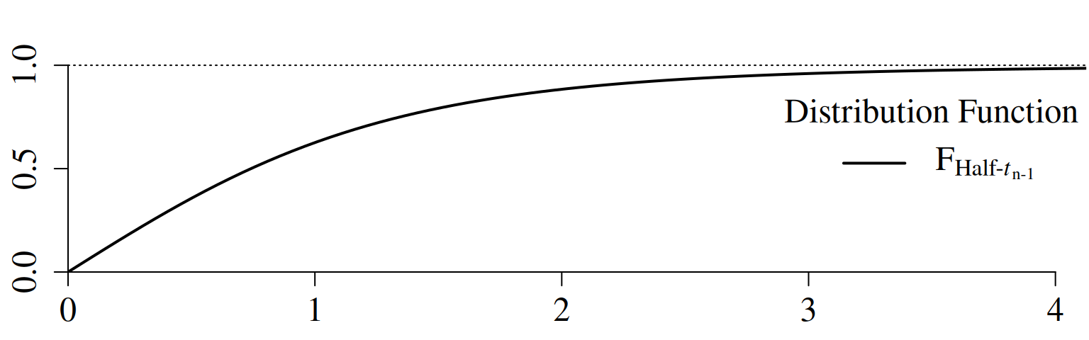 \[\begin{align*} \mathrm{F}_{\,\text{Half-}t_{n-1}}(x)&=\mathrm{P}(|\textrm{T}|\leq x\mid H_0\;\text{is true}),\quad |\textrm{T}|\overset{H_0}{\sim} \textrm{Half-}t_{n-1} \end{align*}\]