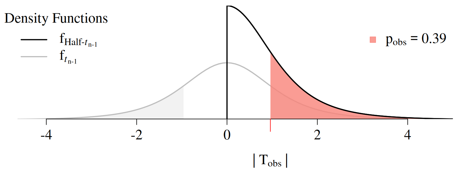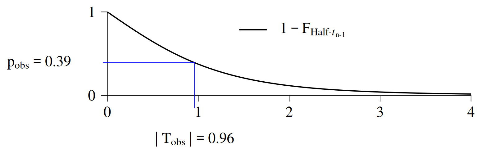 \[\begin{align*} \mathrm{p}_{\mathrm{obs}} &=1 - \mathrm{F}_{\,\text{Half-}t_{n-1}}\big(|\mathrm{T}_{\mathrm{obs}}|\big)\\ &=1 - \mathrm{F}_{\,\text{Half-}t_{n-1}}\big(\,0.96\,\big)=0.39 \end{align*}\]